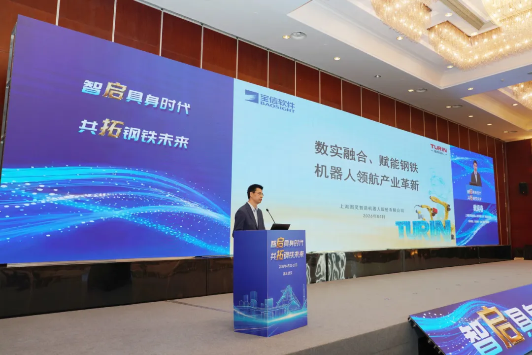4月24日,由冶金工业信息标准研究院主办,武汉钢铁有限公司、上海宝信软件股份有限公司(以下简称:宝信软件)联合承办的第七届钢铁工业智能制造大会暨“机器人+钢铁”协同应用创新研讨会在武汉成功召开。宝信软件所属上海图灵智造机器人股份有限公司(以下简称:图灵机器人)常务副总经理戴锡春出席大会,并作《数实融合、赋能钢铁:机器人领航产业革新》报告。