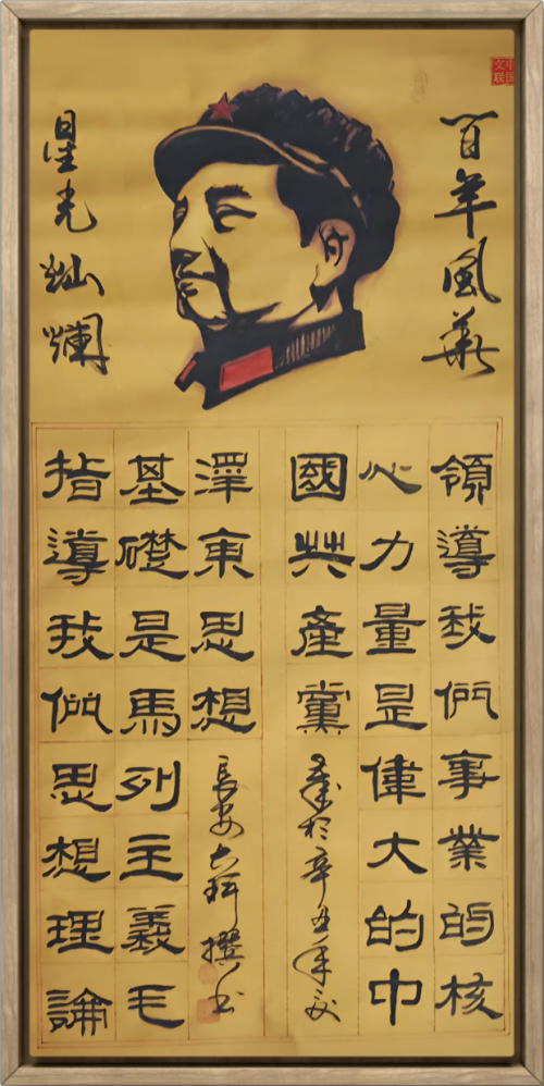 其所作诗词系列作品,气势恢宏,笔力千钧,将诗词中的壮阔意境与书法的视觉张力完美融合。如《沁园春·雪》一作,以雄强笔势写“山舞银蛇,原驰蜡象”,使文字意象化为笔墨的直接呈现;《沁园春·长沙》中“指点江山,激扬文字”的豪情,亦在其笔下得到淋漓尽致的挥洒。这种红色题材的创作,使其书法超越了纯粹的艺术欣赏,而成为时代精神的视觉载体。