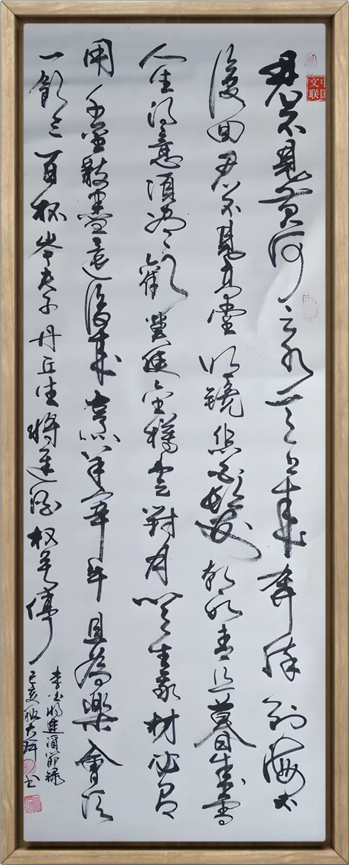 章法布局尤见所长。其作品往往整体气势夺人,远观如群山起伏,近察则细节精微。疏可走马、密不透风的经营,使书作既有磅礴之势,又耐人寻味。商子雍先生特别指出其书法中的“书卷气”,认为这是区别于“匠气”的关键所在。这种书卷气,正是数十年文学修养的自然流露,是数百万字文学作品积淀而成的文化底蕴。